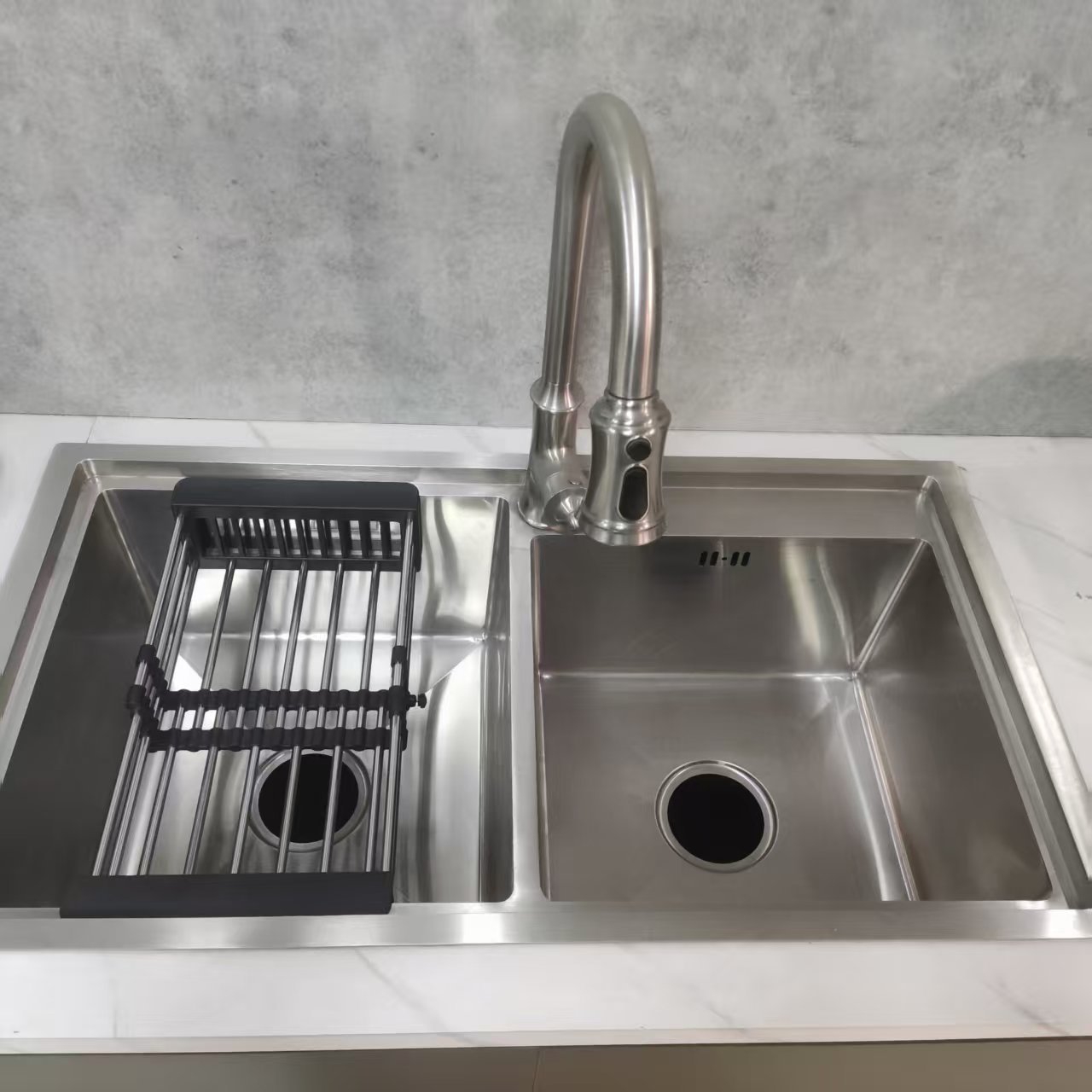 | Кухонный раковина с высоким дугом | 900×550×230 мм | Большоугольный выход воды |